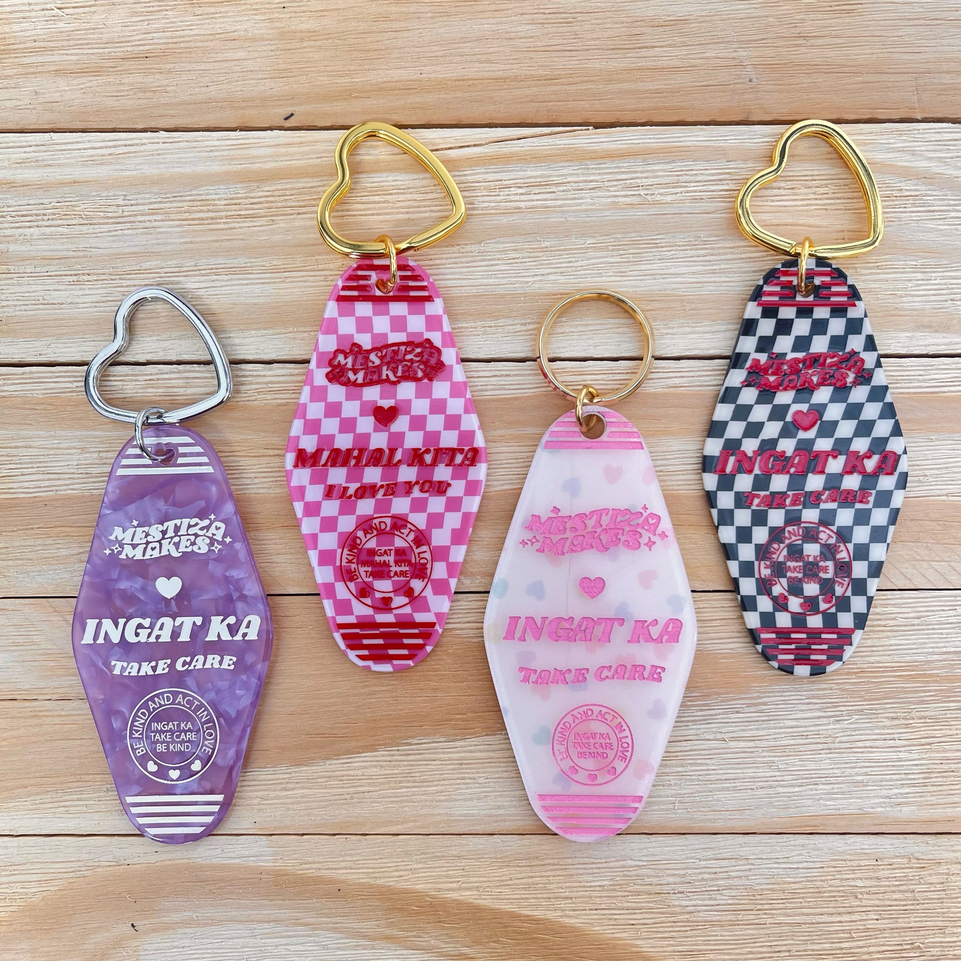 ♡ Ingat ka means “take care” in Tagalog, written on the black checker and lavender keychains